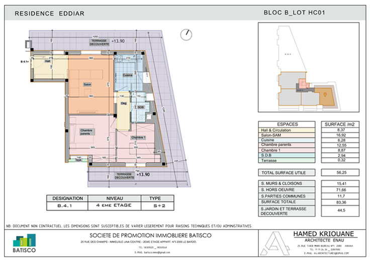 | 4ème | B.4.1 | S+2 | 83.4 | 44.5 | 260,000 TND | Disponible | Voir Plan |